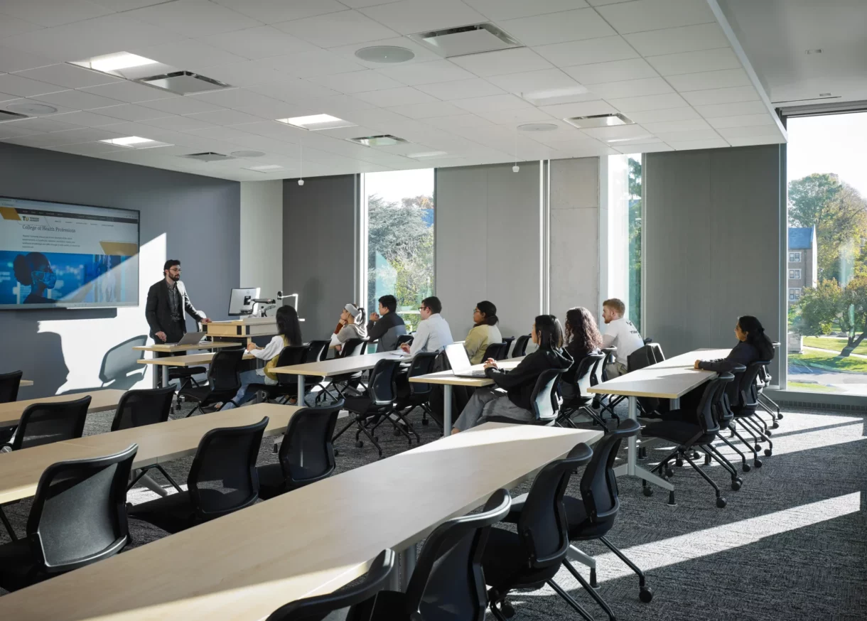Towson University’s College of Health Professions (CHP) building consolidates the dean’s office and the Health Professions Departments at the University: Nursing, Health Sciences, Kinesiology, Occupational Therapy and Occupational Science, and Speech-Language Pathology and Audiology.