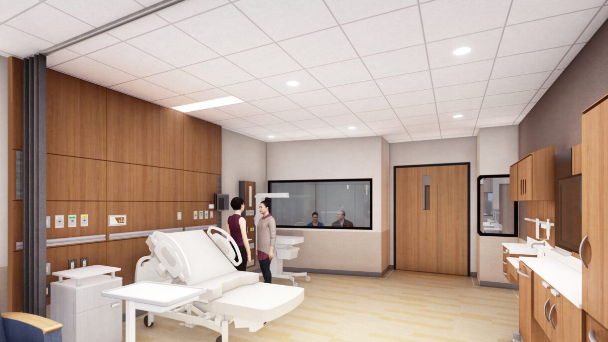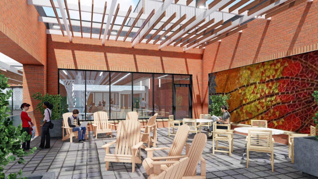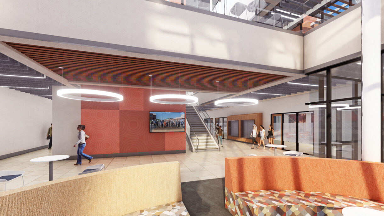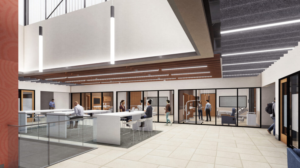 The new building anchors the northern edge of campus and while to the campus, sets a vision for the future of East Central University. Program areas group about a central building commons tied to programmable usable exterior spaces. The building offers a high degree of transparency both inwardly and outwardly to the community by putting these programs on display. The commons is supported by plentiful student collaboration areas, group study rooms, café, and lounges that have no peer elsewhere on campus. The new building also expands opportunities for community connections for continuing education and event planning. Large classrooms will have operable glass partitions to expand use into the commons for public and college events and other classrooms are able to open into labs for on-going lifelong learning and competency training for partner hospitals.